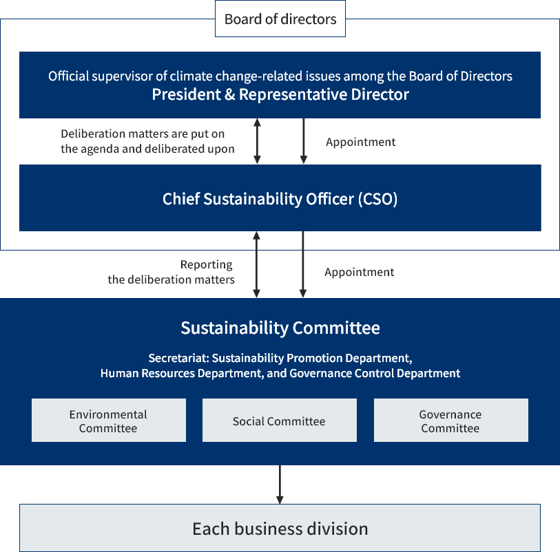 The Sustainability Committee is divided into Environmental, Social, and Governance Committees. They manage and promote ESG initiatives in each business division (all group companies).